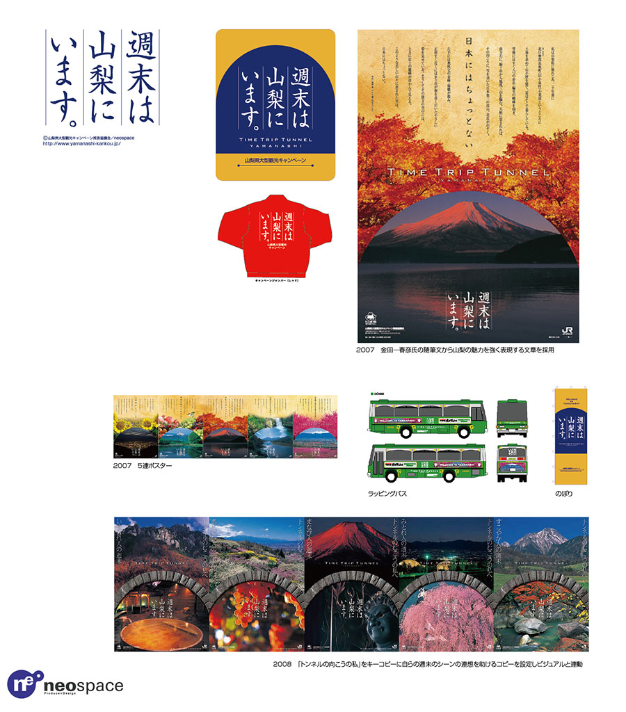 風林火山ブームの創出で広好調な観光客誘致を実現した年から始まったキャンペーン。メインテーマである「週末は山梨にいます。」の定着を図る一連の展開のイメージを統一するためのツール群のデザイン。